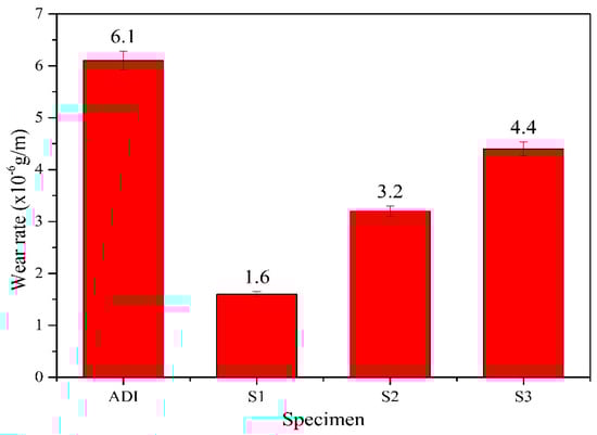 From the comparison of the wear rate of each specimen in Figure 13, it can be seen that all the coated specimens have lower wear rates (1.6–4.4 × 10−6 g/m) than the uncoated ADI (6.1 × 10−6 g/m), so the wear resistance of ADI can be significantly improved by the CrAlSiN multilayer coatings. The wear rate of the three coated specimens was further compared, and the wear rate of S1 was the lowest (1.6 × 10−6 g/m), followed by S2 (3.2 × 10−6 g/m), and then S3 (4.4 × 10−6 g/m). Such a result is consistent with the aforementioned trend of H/E values, i.e., the larger the H/E value for the coating material, the smaller the wear rate. The findings can also be supported by some related literature [33,37,42].