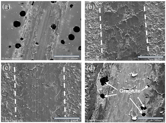 The surface wear tracks of the specimens after wear tests: (a) ADI, (b) S1, (c) S2, and (d) S3. The arrows indicate exposed graphite.