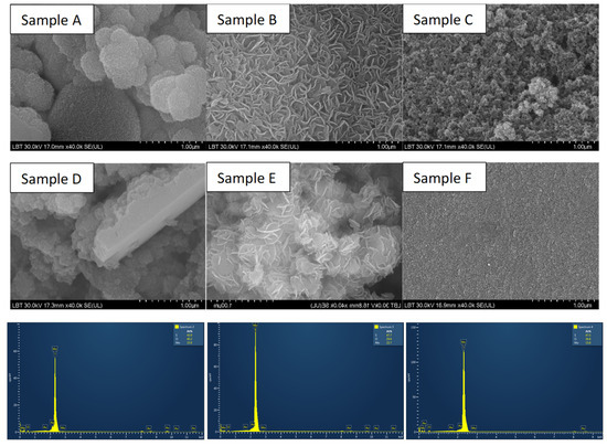 SEM images of MoS2 samples using sodium molybdate and L-cysteine (Sample A), thiourea (Sample B), thioacetamide (Sample C), and ammonium molybdate combined with L-cysteine (Sample D), thiourea (Sample E), thioacetamide (Sample F), and their corresponding EDX measurements (presented in the same order as the samples in the SEM images).