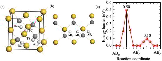 The solution and diffusion behaviors of H in a perfect 3C-SiC bulk were investigated as a reference. The supercell of 3C-SiC contains 108 C and 108 Si atoms. There are five initial interstitial sites: the tetrahedral center site of four Si atoms (TSi), the tetrahedral center site of four C atoms (TC), the hexagonal site neighboring three C and three Si atoms (Hex), the bond center site of C and Si atoms (BC), and the site along the anti-bonding direction of C-Si bonds (ABC) [37,38]. H at the Hex site is not stable, which moves to the TSi site. The calculated solution energies for H at the other four stable interstitial sites are shown in Table 1. The solution energies for H at the TC, TSi, and BC sites are 3.61, 2.93, and 2.60 eV, respectively, much higher than that of H at the ABC site (2.48 eV). Hence, the solution energies follow the following order: TC > TSi > BC > ABC, where ABC is the most stable interstitial site for H. Our results are consistent with the previous calculation results [39,40,41]. The diffusion path of H in the perfect 3C-SiC bulk and the corresponding diffusion energy barriers of H are shown in Figure 1b,c. The energy barrier for a H atom jumping from an ABC position on the C atom to the equivalent position AB′C on the nearest neighboring C atom is 0.50 eV. The H can also rotate around a C atom between AB′C and AB″C, and the barrier is just 0.10 eV. It can be known that the migration energy barrier of H in the perfect 3C-SiC bulk is 0.50 eV, the same as the result of Kaukonen et al. [27].