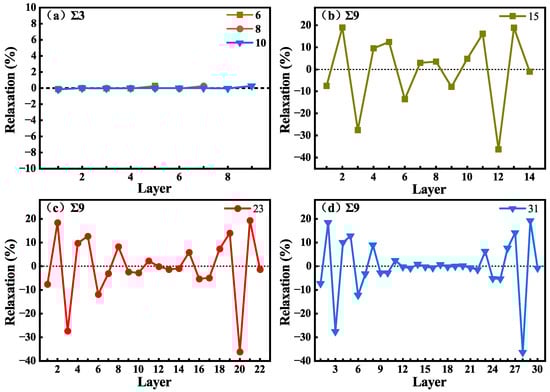 As shown in Figure 2, no vacuum layer was added when constructing the GB structures. To reduce the effects of interactions between periodic images in subsequent calculations, the GB size should be large enough to eliminate interactions between the two GBs, and the system should contain a bulk-like environment in the supercell. The structures of GBs with different C-Si atomic layers were constructed, and the GB energies were calculated and are shown in Table 2. The parameters of and GBs are the same, because their supercells are essentially the same and the is the average energy of a Si-rich GB and a C-rich GB in the supercell. The of and GB with 6, 8, and 10 C-Si atomic layers are 1.39 J/m2. The of 9 GB with 15, 23, and 31 C-Si atomic layers are 1.35 J/m2. The values of for the GB systems agree well with the previous calculation results [17]. In addition, for 9 GB, a 3 × 1 × 1 supercell containing 23 C-Si atomic layers was calculated, and other supercells are 2 × 1 × 1, which verifies that in the direction, the periodic interaction has no effect on the results. As shown in Table 2, it can be found that the of the three GBs does not change with the increase in atomic layer number. The results suggest that GB sizes are large enough to eliminate interactions between the two GBs in the supercell. To verify that the GBs contain a bulk-like structure, the changes in C-Si atomic layer spacing () in the supercell were calculated. is defined as the percentage change in the vertical positions of two subsequent atomic layers (di and dj) with respect to the inter-planar distance (d) in the bulk system, which can be written as = [(dj − di) − d]/d. The changes in atomic layer spacing in the [111] direction for GB and in the [221] direction for 9 GB are presented in Figure 3 as a function of the layer away from the grain boundary plane. In the other two directions, the changes are neglected. Figure 3a displays the changes in the layer spacing of GBs with 6, 8, and 10 C-Si atomic layers. It can be seen that the changes are close to zero, revealing very small relaxations between the atomic layers. However, in Figure 3b–d, the spacing changes of 9 GB with 15, 23, and 31 C-Si atomic layers are different. It can be found that the change in layer spacing near the GB fluctuates greatly and shows a trend of oscillation. The expansion of is up to about 18%, and the contraction of is up to about 28%. In the 31 atomic layers of the 9 GB, the negligible changes for the layers from 12 to 22 indicate that the atomic relaxation is localized only within 12 layers from the GB. Therefore, the supercell containing 31 layers between the two GBs is large enough to reflect the characteristics of the GB and provides a bulk-like area.