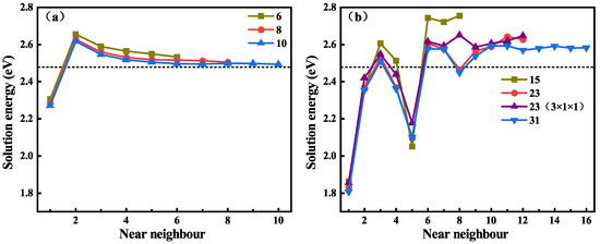 The solution behavior of H at the ABC site on different C-Si layers near the GB in the supercell was calculated, and the solution energy for H at different neighboring locations along the GB is shown in Figure 4, where the black dotted line represents the lowest solution energy of H in the perfect system. Figure 4a is the solution energy of H near the GB, and the GBs have three different C-Si atomic layers. It can be seen that the three curves of the solution energies show the same trend. The solution energy of H near the 6-layer GB is the largest, and the solution energy of H near the 8-layer and 10-layer GBs are very close, but only the curve of the solution energies along the 10-layer GB shows convergence. Combined with the content of the previous section, it was decided to use 10-layer and GBs for subsequent research. Figure 4b shows the solution energy of H in the vicinity of 9 GB, and the 9 GB contains three different C-Si atomic layers and a 3 × 1 × 1 structure of 23 atomic layers. For the 15, 23, and 31-layer GBs, the solution energies of H on the nearest 8, 12, and 16 layers were calculated, respectively. It can be seen that the variation trend and the value of the solution energy of H on the first six layers of the four GBs are almost similar, and the differences become relatively large thereafter. The solution energy begins to converge steadily from the sites of the tenth atomic layer. By comparing the solution energy curves of H near the two different 23-layer GBs, it can be found that they are very close to each other. Hence, the thickness change in the direction has little effect on the results, and the 2 × 1 × 1 supercell of the 31-layer GB was used for subsequent calculations. In addition, the influence range of 9 GB on the solution energy of H is greater than that of the GB. This is attributed to the more open structure of the 9 GB compared with the GB [44]. Overall, the solution energy of H near the GBs is significantly lower than that of H in the bulk-like regions. This suggests that GBs may be a deep trapping region for H atoms.