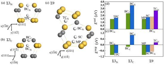 Three GBs, i.e., Si-rich and C-rich 3(111)[10] ( and ) and 9(221)[10] (9), were studied and discussed, and were constructed using the coincidence site lattice model. The structures of , , 9, and the basic structural units in the GBs are shown in Figure 2. The supercells of and contain six C-Si atomic layers, and fifteen C-Si atomic layers are in the 9 supercell. The structural units of and GBs have a high similarity, all of which contain six atom rings [42,43]. 9 GB is composed of two different polyhedrons with seven-atom rings and five-atom rings, respectively. The excess volumes of the GBs were calculated to be 0.27, 0.07, and 0.07 Å for 9, , and , respectively. The excess volume of 9 is much higher than that of 3, indicating that 9 has a much more open structure than 3. Since both the supercells of and contain a Si-rich GB and a C-rich GB, the excess volumes are the same. The Si-Si bond length in the Si-rich GB is 2.40 Å, and the C-C bond length in the C-rich GB is 1.64 Å. The Si-rich GB is more open than the C-rich GB.