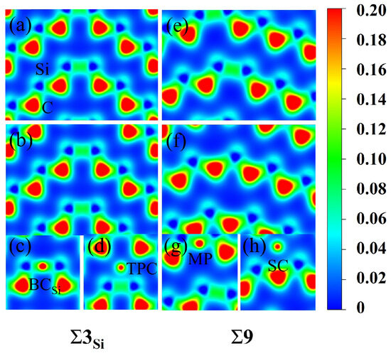 To further understand the segregation behavior of H in SiC GBs, the charge density of the above different configurations were calculated here [45]. The charge density maps of and 9 GBs without H are shown in Figure 6, where a, b and e, f represent the charge density maps of two different atomic layers without interstitial H in the direction. The charge densities of H at the sites and TPC in the GB, and MP and SC in the 9 GB are also presented in Figure 6 for comparison. The charge density between H and Si atoms in the and MP configurations is denser than that in the TPC and SC configurations in and 9 GBs, respectively. H at MP and sites has a stronger bond with its surrounding Si atoms, while H at TPC and SC sites are in a relatively isolated state and has a weak interaction with its surrounding atoms. Figure 7 shows the partial density of states (PDOSs) of H in the MP position of the 9 GB. The s orbital of H and the s and p orbitals of the closest Si are shown in the figure. It can be found that the s orbitals of H and Si have a hybridization peak near −11 eV, which indicates that there is a chemical bond formation between them. Therefore, the reason for the low solution energy of H at the MP and sites may be that the H atom is more active and easy to form chemical bonds with its surrounding atoms, which is similar to the behavior of oxygen, magnesium, and other elements in SiC GBs [17,18].