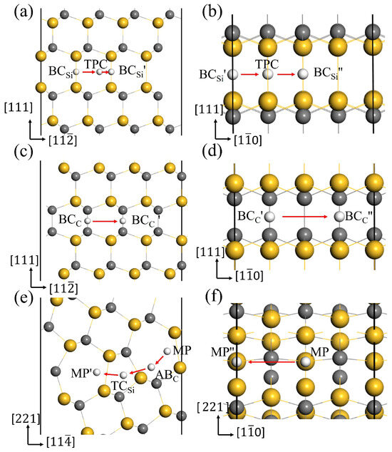 For the 9 GB, we investigated H migrating between the most stable interstitial sites MP and its equivalent sites and . The diffusion path for H along the direction is MP→ABC→→, as shown in Figure 8e. Starting from the MP site, H needs to overcome the energy barrier of 1.29 eV to reach the ABC site, then it must surmount the energy barrier of 0.42 eV to reach the site in the 5-atom ring, ultimately reaching the stable site of . Therefore, the diffusion barrier of H in the direction of 9 GB is 1.29 eV, much larger than 0.5 eV. The diffusion path for H in the direction is shown in Figure 8f, and the diffusion energy barrier is shown in Figure 9f. H hops between MP to and proceeds via the metastable site SC. The diffusion barrier is 0.28 eV, much lower than 0.5 eV. The results show that the diffusion of H in the two directions of 9 GB is anisotropic. The diffusion of H along the direction is difficult, while the diffusion of H in the direction is easy. The MP→ along the direction of the 9 GB is likely to serve as a fast diffusion path for H. This is the same as the diffusion behavior of helium in the 9 GB of 3C-SiC [46]. This phenomenon may be attributed to the diffusion path of H within an open structure containing seven-atom rings along the direction. While H diffuses along the direction, it needs to pass the region with high atomic density, so the diffusion energy barrier is relatively high. This is similar to the diffusion phenomenon of H in the 9 GB of -Fe obtained by He et al. [47].