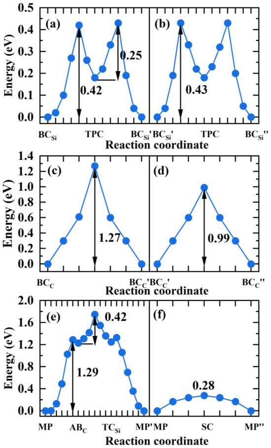 In the above section, the most stable interstitial sites for H in GBs have been obtained. The diffusion behavior of H along the 3C-SiC GBs was investigated using the CL-NEB method, and the optimal diffusion paths for H in the two directions of GBs were obtained. Figure 8 displays the diffusion paths of H along the two directions at the GB interface, and the corresponding migration energy barriers are shown in Figure 9.