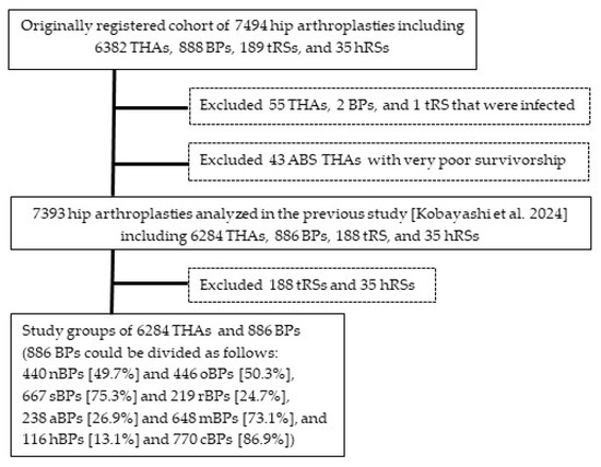 The flowchart of selecting the study groups of 6284 primary total hip arthroplasties (THAs) and 886 bipolar hemiarthroplasties (BPs) from the originally registered cohort of 7494 hip arthroplasties. tRSs: total resurfacing arthroplasties; hRSs: hemi-resurfacing arthroplasties; nBPs: a new type of BPs; oBPs: other BPs; sBPs: BPs with a smooth neck; rBPs: other BPs with a rough-surfaced neck; mBPs: BPs with a metal outer head; and aBPs: BPs with an alumina outer head. Kobayashi et al. 2024 [13].