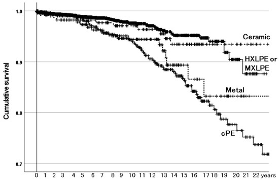 The Kaplan–Meier estimator illustrated the effects of the acetabular-articulating materials on the survivorship of THAs with need for reoperation as the endpoint (Figure 2). Compared with the HXLPE or MXLPH group, the cPE and metal (metal-on-metal THA) groups had inferior survivorship, but the ceramic (ceramic-on-ceramic THA) group did not. The rates of need for reoperation were also different among them in a χ2-test (p < 0.001): 1.8% in the HXLPE or MXLPE group, 11.6% in the cPE group, 6.6% in the metal group, and 4.3% in the ceramic group.
