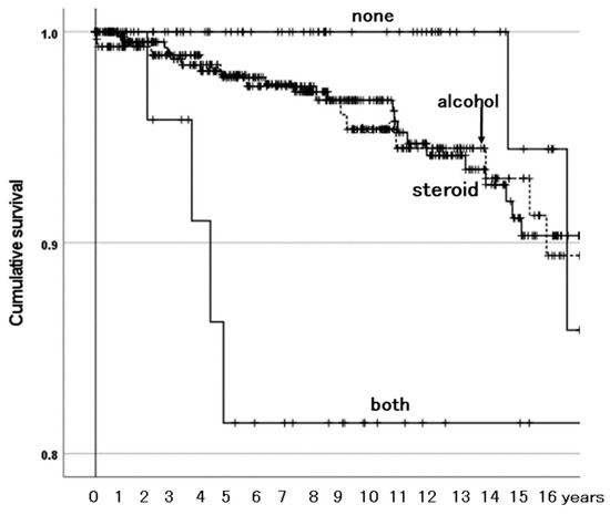 Systemic steroid use [6] and excessive alcohol consumption [15,16] were risk factors associated with reoperation in THAs for ONFH. In the present study, the combined existence of both factors was a risk factor related to need for reoperation not in the THAs but in the BPs. This is reported for the first time to our knowledge.