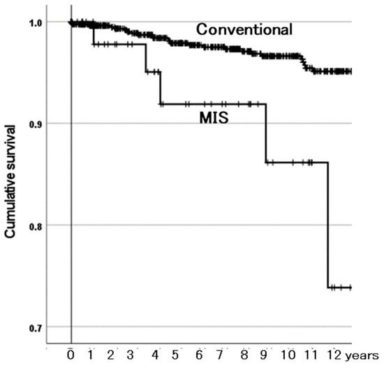 The cumulative survival of bipolar hemiarthroplasties (BPs) between incision length groups with need for reoperation as the endpoint. Conventional: conventional incision. MIS: minimum-incision surgery. Their survival rates were 97% and 86% at 10 years, respectively. The MIS group had lower survivorship than the conventional group (p < 0.001).