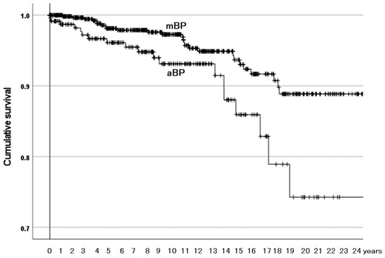 The Kaplan–Meier estimator illustrated the effects of the three identified risk factors on the survivorship of BPs with need for reoperation as the endpoint. Among the ONFH-associated factor groups, the group with both factors was at a higher risk than the other groups (Figure 3). The other groups were not different from one another in survivorship. The MIS group had lower survivorship than the conventional incision group (Figure 4). The aBPs had lower survivorship than the mBPs (Figure 5). The rates of need for reoperation were also different between them in a χ2-test (p = 0.014): 4.2% in the mBPs and 8.4% in the aBPs. In both groups, the proximal migration of the outer head was the main reason for need for reoperation in 17 of 27 (63.0%) of the mBPs and 13 of 20 (65.0%) of the aBPs (Table 7).