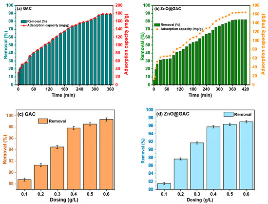 Effect of contact time (a,b) and adsorbent dosage (c,d) on TC adsorption towards GAC and ZnO@GAC (CO = 50 mg/L, adsorbent dosage = 50 mg, volume of solution = 100 mL, temperature = 298 K, and pH = 5.5).
