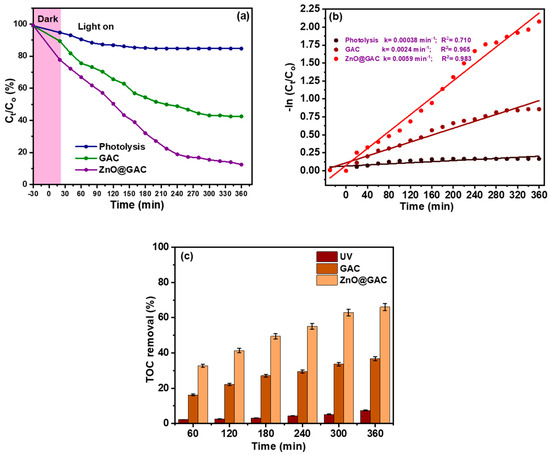 The TC photocatalytic degradation kinetics curve displayed in Figure 2b shows a good linear relationship with time, suggesting that the TC degradation on GAC and ZnO@GAC could be best explained by the pseudo-first-order model [37]. The photocatalytic degradation rate kinetics constants of TC under UV light (without catalyst), GAC, and ZnO@GAC were 0.00038, 0.0024, and 0.0059, respectively. Notably, the rate kinetic constant of TC degradation onto ZnO@GAC was observed to be 15.5 and 2.5 times that of UV (without catalyst) and GAC, respectively, demonstrating that the ZnO@GAC exhibited a superior degradation performance. Furthermore, the TOC removal rate by GAC and ZnO@GAC after photodegradation, as shown in Figure 2c, revealed that within 60 min, only 16.2% and 32.7% mineralized. However, after 360 min of degradation time, the TOC removal rate of TC by UV-light only, GAC, and ZnO@GAC was observed to be 7.4%, 36.8%, and 66.1.%, respectively. The partial mineralization of TC by UV-light only, GAC, and ZnO@GAC could be attributed to the partial TC oxidation and its immediate photodegradation by reactive species [38]. Furthermore, the TOC removal rate increase with increasing irradiation time could be attributed to the fact that incident light irradiation becomes easier as the irradiation increases to penetrate the internal TC solution, thereby promoting the number of photogenerated carriers [39].