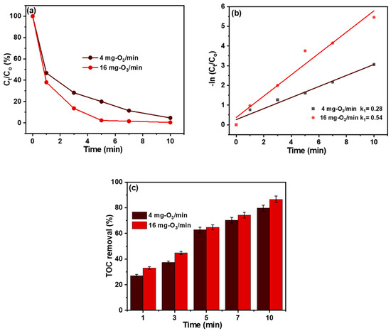 The TC degradation under the influence of ozonation and the determination of their performance at different dosing concentrations (4 mg-O3/min and 16 mg-O3/min) were investigated. As shown in Figure 3a, with an increase in the ozonation dosage from 4 mg-O3/min to 16 mg-O3/min, the TC removal rate after 10 min increased from 95.3% to 99.6%. The increase in the TC degradation rate with increasing ozone concentration could be attributed to the fact that at increased dosing concentrations, the mass transfer driving force is enhanced, thereby promoting the ozone volumetric mass transfer coefficient from the gaseous phase to the liquid phase [40]. Moreover, the pseudo-first-order kinetics plot depicted in Figure 3b demonstrates that the reaction rate constant (k1) of 16 mg-O3/min (0.58 min−1) was observed to be about 2.1 times higher than that of 4 mg-O3/min (0.28 min−1), suggesting that the increase in dosing concentration promotes TC ozonation [41]. Furthermore, the TC mineralization presented in Figure 3c reveals that the TOC removal efficiency increased with increasing dosing concentration and ozonation time, from 27.1% (1 min) to 79.7% (10 min) for 4 mg-O3/min and 33.04% (1 min) to 86.6% (10 min) for 16 mg-O3/min, respectively. This suggests that only 20.3% and 13.4% of degraded TC cannot be completely mineralized and transformed into carbon dioxide; therefore, higher TC mineralization leads to TC toxicity reduction [42]. Furthermore, this demonstrates that at higher dosing concentrations, the ozone (O3) generated sufficient ability to destroy and transform almost all the dissolved organic content in TC into carbon dioxide (CO2), thereby reducing their toxicity [43] Thus, if higher TC is to be removed, then a higher dosing concentration may be needed to achieve it.