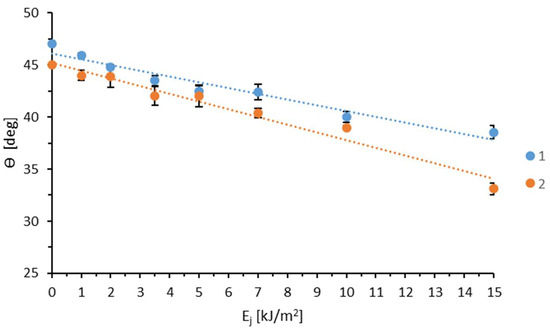 Effect of unit energy (Ej) on water (1) and diiodomethane (2) contact angle (ϴ).