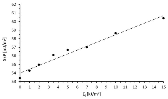 With the increase in Ej value, SEP increases. The changes in the SEP values of TPS film modified in air range from 53.4 to 60.39 mJ/m2. The increase in SEP is primarily caused by the rise in the polar component, which results from the formation of polar groups that strongly interact with water molecules and enhance wettability.