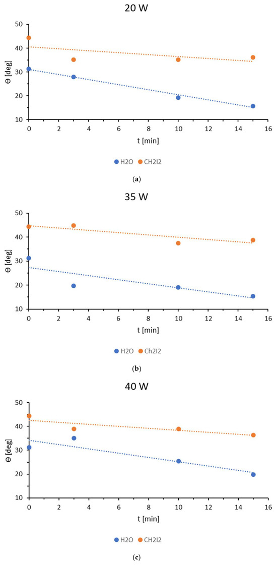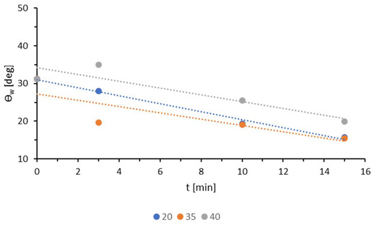 Analyzing the results for all applied modification powers, it is evident that low-temperature plasma has a greater influence on the contact angles of water than on those of diiodomethane. For each power used, the change in wettability for the polar liquid was more pronounced. As previously mentioned, during modification with low-temperature plasma, polar groups are formed that strongly interact with water molecules, thereby increasing the wettability of the top layer of the TPS film. To facilitate the comparison of water contact angles, they are presented in a collective graph in Figure 4. The smallest contact angles for the polar liquid at each tested time were observed for the sample modified with 35 W. This power also shows the sharpest decrease in the contact angle during the first three minutes of modification. Similar effects were observed for 20 W and 35 W with modification times of 10 and 15 min. However, for 20 W, the decrease in the contact angle is more linear. In these cases, the measurement results differ by a maximum of 0.4°.