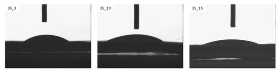 The optimal technological parameters for the low-temperature plasma modification of the TPS film are a generator power of 35 W and a modification time of 3 min, as these conditions result in the sharpest increase in wettability. During the measurements, photos of water droplets deposited on the modified samples were taken. Figure 5 shows sample images of the measuring droplet for the TPS film modified with plasma under reduced pressure using a 35 W power generator. As the modification time increases, the shape of the measuring liquid droplet becomes flatter.