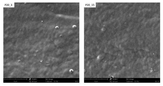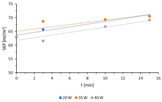 For all applied power levels, the most pronounced changes in SFE were recorded within the first three minutes of treatment. The further extension of the modification time did not lead to a significant increase in SFE, particularly in the 10–15 min range. The TPS film modified at 20 W for 10 min exhibited an SFE of 69.3 mJ/m2, whereas prolonging the modification by an additional 5 min resulted in a marginal increase of only 1.24 mJ/m2. This effect is likely attributable to the saturation of the surface layer with polar functional groups, which enhance the sample’s wettability. The modification effects at 20 W and 35 W were highly comparable within the 10–15 min treatment period. The highest SFE value recorded in this study was 70.59 mJ/m2, observed at a modification time of 15 min and a generator power of 20 W. However, the most rapid increase in SFE was noted within the first 3 min of modification at 35 W.