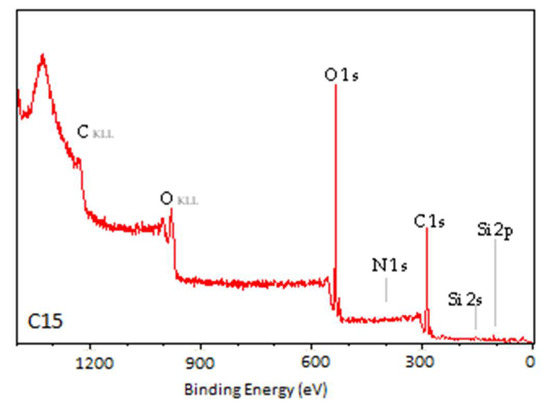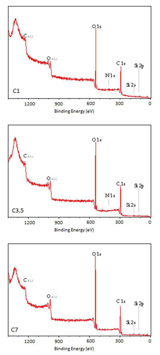 XPS general spectrum of the C1, C3.5, C7, and C15 samples.