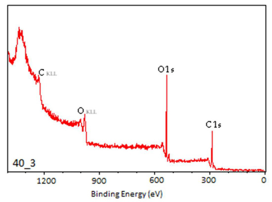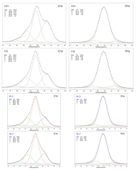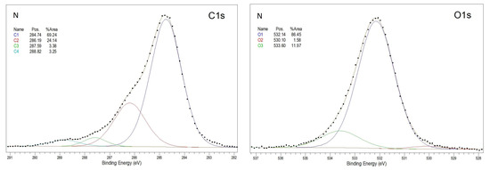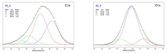 Figure 10 shows the qualitative analysis of functional groups in the TPS surface layer, based on detailed spectra of the C1s and O1s peaks. The peak corresponding to photoelectrons from the C1s level was fitted with four components. Individual peak components corresponding to carbon atoms of different functional groups are marked with colors: blue, red, green, or turquoise. Analogously, the peaks assigned to oxygen atoms of different functional groups are marked with blue, red, or green. The first component, labeled C1 (blue), appears at approximately 284.7 eV and corresponds to graphite-like C–C bonds as well as C–H bonds. The C2 peak (red), observed at around 286.2 eV, is associated with C–O bonds. The C3 peak (green), recorded at approximately 287.6 eV, originates from photoelectrons of the C=O group. The peak labeled C4 (turquoise), detected at around 289.0 eV, most likely corresponds to photoelectrons from the O–C=O group.