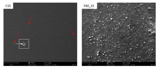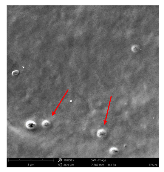 In contrast to low-temperature plasma, corona discharges do not induce significant changes in the geometric structure of the TPS film surface. The primary difference in their effects lies in the formation of streamers—branched plasma channels—during corona discharge modification, leading to uneven surface modification. In Figure 13, for C15, in addition to a thin layer of oligomers, areas of deeper degradation (burnt holes, marked with red arrows in Figure 13) caused by plasma streamers can be observed.