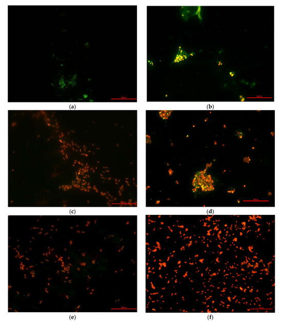 Microscopic images of the TPS film samples with the deposited and stained bacteria of the Salmonella enteritidis: (a) N, (c) C7, (e) C15, and Staphylococcus aureus strain: (b) N, (d) C7, (f) C15.