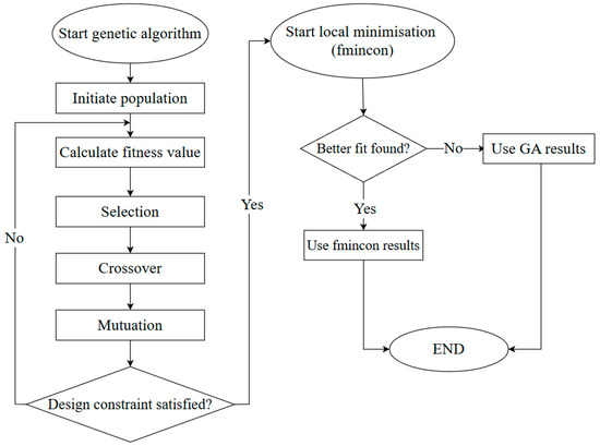 For this research, a hybrid genetic algorithm was employed to minimise the embodied carbon in tension pile designs, as shown in Figure 4. Genetic algorithms are particularly well suited for navigating complex, multi-dimensional design spaces, but they do not guarantee convergence to a global optimum [61]. Therefore, and to enhance precision and avoid premature convergence, a two-stage approach was adopted as follows:
