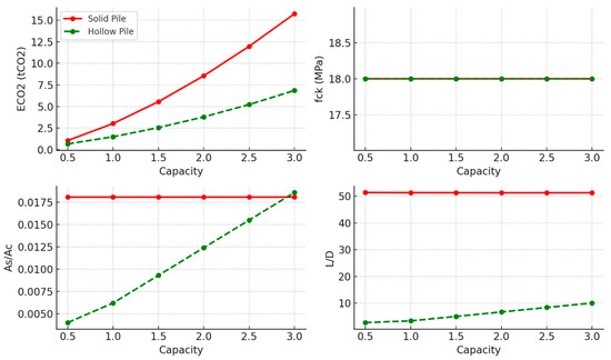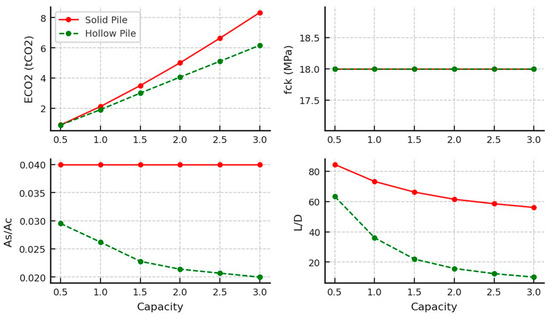 The results of the optimised concrete piles in undrained clay soil are shown in Figure 6 and Table 4. They indicate a clear distinction between the performances of the solid and hollow pile designs. Hollow piles demonstrated lower embodied carbon values across the entire tested capacity range, showcasing their material efficiency and sustainability potential. However, this advantage was associated with a rising optimal steel-to-concrete ratio (As/Ac). In contrast, solid piles exhibited a notably higher slenderness ratio (L/D), indicating that they may be less efficient in terms of developing surface friction. Moreover, all pile designs favoured a consistent lower-bound compressive strength (fck = 18 MPa) across capacities, implying that the concrete strength did not govern the observed variations in embodied carbon or L/D ratios, the design was governed by the geotechnical capacity of the pile and the reinforcement steel deployed, and that a minimal concrete grade is needed to build a pile body with sufficient surface friction resistance and steel cover.