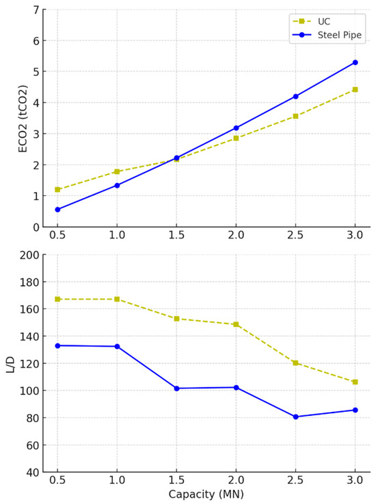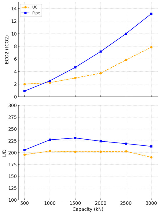 Figure 7 compares the performance of universal column (UC) and steel pipe piles. The steel pipes demonstrated a steep increase in embodied carbon beyond 1MN, making them less environmentally efficient at higher capacities. In contrast, the UC piles managed to maintain lower embodied carbon levels across the range, indicating that they may offer a more sustainable option for larger loads. However, this was offset by a more pronounced peak in the slenderness ratio (L/D), where UC piles seemed to require greater length-to-diameter proportions before stabilising, as shown in Table 5. The pipes, by contrast, exhibited a gradual decline in their L/D ratio. It also should be noted that the inconsistency in the UC data was due to approximations to the nearest universal column sections provided by the manufacturers [64].