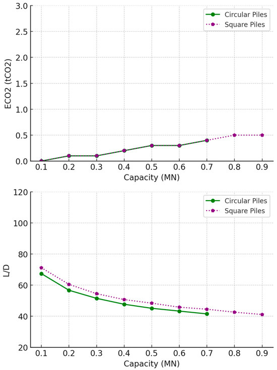- In loose sand, timber piles, though limited to lower capacities, are the most sustainable options for low-capacity piles, with minimal differences in embodied carbon and L/D ratios between circular and square designs. Both concrete and steel piles exhibited more compact, material-efficient designs due to steeper declines in their optimal L/D ratios compared with the designs for use on undrained clay. Regarding high-capacity piles, UC steel piles outperformed other pile types in terms of embodied carbon.