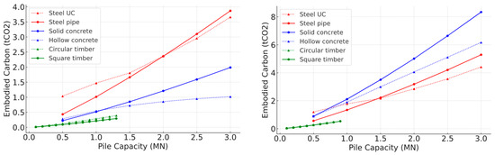 All pile designs presented in this study were optimised to provide the same axial tensile resistance (e.g., 1.0 MN), ensuring that they were functionally equivalent. Each design satisfied both structural and geotechnical safety requirements, as defined by the relevant Eurocodes (EC2, EC3, EC5), and all designs met standard safety factors and material utilisation limits. It is important to emphasise that the goal of this comparison was not to maximise capacity, but to minimise embodied carbon for a fixed performance level. The variation in embodied carbon is therefore a direct result of the material mass required to meet the functional load.