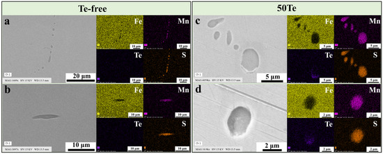 - Wang, F.; Guo, H.; Liu, W.; Yang, S.; Zhang, S.; Li, J. Control of MnS Inclusions in High- and Low-Sulfur Steel by Tellurium Treatment. Materials 2019, 12, 1034–1042. [Google Scholar] [CrossRef] [PubMed]