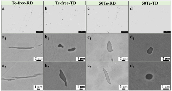 Consequently, Figure 5b reveals that the average 2D aspect ratio of inclusions in the 50Te billets was also slightly lower than in the Te-free counterparts. As demonstrated in prior studies, inclusions undergo substantial deformation during billet rolling. Figure 5 highlights that the disparity in MnS characteristics between the two steels predominantly occurs in the rolling direction (RD) of the rods. Specifically, Figure 5b shows that rolling increased the average 2D aspect ratio of inclusions in the Te-free steel from 1.94 to 2.91 (50% deformation rate), while the 50Te steel exhibited a significantly lower deformation rate of 29.32%. These findings confirm that the 50Te steel experienced markedly less inclusion deformation, further supported by the ECD variations depicted in Figure 5a. The enhanced rolling deformation resistance of sulfides in Te-treated steel may be attributed to two mechanisms. First, Te treatment promotes the formation of a Te-rich layer encapsulating MnS inclusions. During hot working, this layer generates a liquid phase that establishes a dynamic buffer zone in stress concentration regions. This buffer dissipates external load energy during rolling, effectively reducing stress transmission to the sulfide matrix and suppressing MnS deformation [14]. Second, the Te addition increases the intrinsic hardness of MnS inclusions. Wang et al. [31] employed nanoindentation to characterize the microhardness of MnS and Mn(S,Te) inclusions. Their results revealed a pronounced rightward shift in the load–displacement curve of Mn(S,Te) compared to MnS, indicating superior deformation resistance in Te-containing inclusions, which minimizes deformation during rolling.