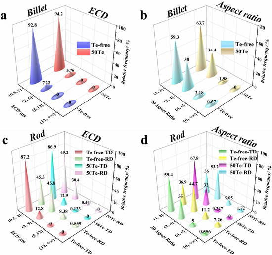 To quantitatively compare MnS inclusion characteristics in the billets and rods of both experimental steels, automated scanning electron microscopy (SEM) was employed to scan and collect inclusion data. The statistical results are presented in Figure 4. Figure 4a,b shows the statistical information of MnS inclusions in the billets before and after Te treatment. The 2D aspect ratios of MnS inclusions in both billets were ≤5, indicating minimal presence of elongated inclusions. In detail, the 50Te billets exhibited a higher proportion of MnS inclusions within smaller 2D aspect ratio ranges, while the Te-free billets contained slightly more large-sized inclusions. Figure 4c,d summarizes inclusion characteristics across different rod cross-sections. For each steel, MnS inclusions in the rolling direction (RD) of the rods tended to exhibit larger ECD and higher 2D aspect ratios. Comparing the two steels, only 10.77% of MnS inclusions in the 50Te-RD samples had 2D aspect ratios > 4, whereas the Te-free-RD samples showed 18.46% in this range. Additionally, elongated inclusions exceeding 12 μm in ECD were observed in the Te-free-RD rods. These statistical results align with the analysis of Figure 3, demonstrating that the 50Te steel exhibits superior distributions in both 2D aspect ratios and the ECD of inclusions.