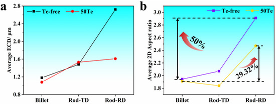 To further analyze the MnS inclusion characteristics in the experimental steels from Figure 4, the 2D aspect ratio and ECD were averaged, with results summarized in Figure 5. As shown in Figure 5a, the 50Te billets exhibited a marginally smaller average ECD of inclusions compared to the Te-free billets. This difference arises from Te enrichment at the solidification front, which reduces surface tension during sulfide precipitation. The lowered surface tension enhances nucleation rates [16,30], resulting in a higher population of finer, near-spherical sulfide inclusions.