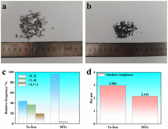 Results of rod cutting experiments: (a) test steel Te-free; (b) test steel 50Te; (c) mass percentage of different shapes of chips; (d) roughness of the cut surface.