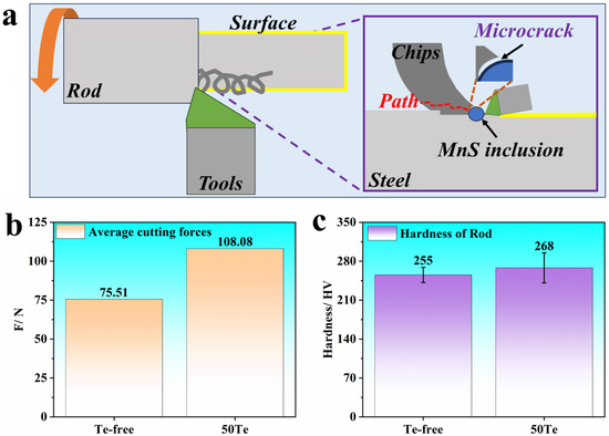 Mechanisms of optimization of cutting properties of industrial rods caused by the Te addition: (a) MnS inclusions inducing microcrack formation; (b) average cutting force during cutting; (c) hardness of industrial rods.
