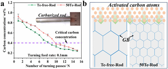 The enhanced carburization efficiency in Te-treated experimental steels can be explained through the analysis of carbon diffusion behavior. When maintaining identical carburizing parameters (thereby eliminating temperature effects on atomic diffusion coefficients), the material’s intrinsic microstructural characteristics become the determining factor for carburization kinetics. Grain boundaries are widely recognized as preferential diffusion pathways due to their structural defect nature, where carbon atoms exhibit higher mobility compared to lattice diffusion within grains. As demonstrated in Figure 9b, coarser grain structures contain relatively fewer grain boundaries, forcing carbon atoms to traverse longer intracrystalline diffusion paths. Conversely, refined grain structures provide an increased grain boundary density, enabling more efficient carbon transport through these enhanced diffusion channels. The microstructural evidence presented in Figure 8 confirms that the 50Te steel maintains finer grains than its Te-free counterpart after carburization. This grain refinement effect significantly augments the available diffusion pathways through grain boundary networks, thereby establishing superior carburization kinetics in the 50Te steel.