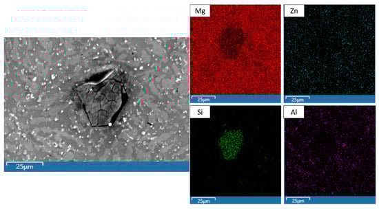 Li was not detected since EDS is unable to detect elements with low atomic radii (atomic number < 4). Figure 2 and Table 5 show the microstructure and EDS results of selected areas within the Mg-71MCA microstructure, and Figure 3 shows the results of Mg-71MCA mapping. Most of the microstructure consists of a Mg matrix, but the dark regions (spectrum 2) and bright regions (spectrum 3) are evident in SEM micrographs. Mapping and EDS results show that bright regions contain more Al, the region where the distinct crack network is clearly seen (spectrum 1). Mapping and EDS show this region is predominantly composed of Mg and Si, which likely contains the Mg2Si intermetallic phase corresponding to the weight fraction of Si in this MCA [27]. In addition, there are a small number of bright particles containing elevated levels of Zn and Al (spectrum 4).