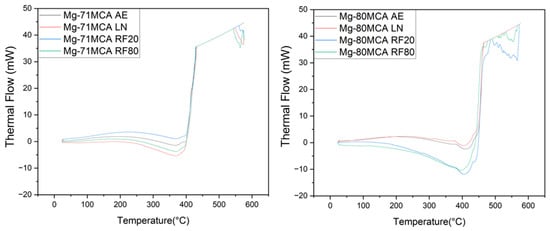 For Mg-71MCA, a distinct exothermic peak is observed around 420 °C, whereas for Mg-80MCA, a clear exothermic peak appears around 450 °C. This demonstrates a good consistency between the thermal responses observed by TGA and DSC, confirming that the pronounced exothermic peaks correspond to oxidation/ignition, while the endothermic trend above 500 °C indicates the partial melting/softening of alloy constituents well below Mg’s melting point of 660 °C.