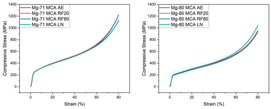 However, the same improvements were not realized in Mg-80MCA. Only LN exposure resulted in compressive response improvements, in line with literature results on LN exposure of Mg-materials [41]. Instead, minor property degradation was exhibited after moderate CT (RF20 and RF80). Slight weakening of the basal texture was observed from the XRD results (Table 8) in absolute terms, by 9.6% and 21.1% after RF20 and RF80, respectively. As the basal texture is responsible for higher strength, such texture changes led to modest decreases in yield strength, ultimate compressive strength, and energy absorption, reflected in Mg-80MCA RF80 experiencing greater compromise in compressive properties [51,57,58]. Overall, LN CT provides the best combined compressive properties.