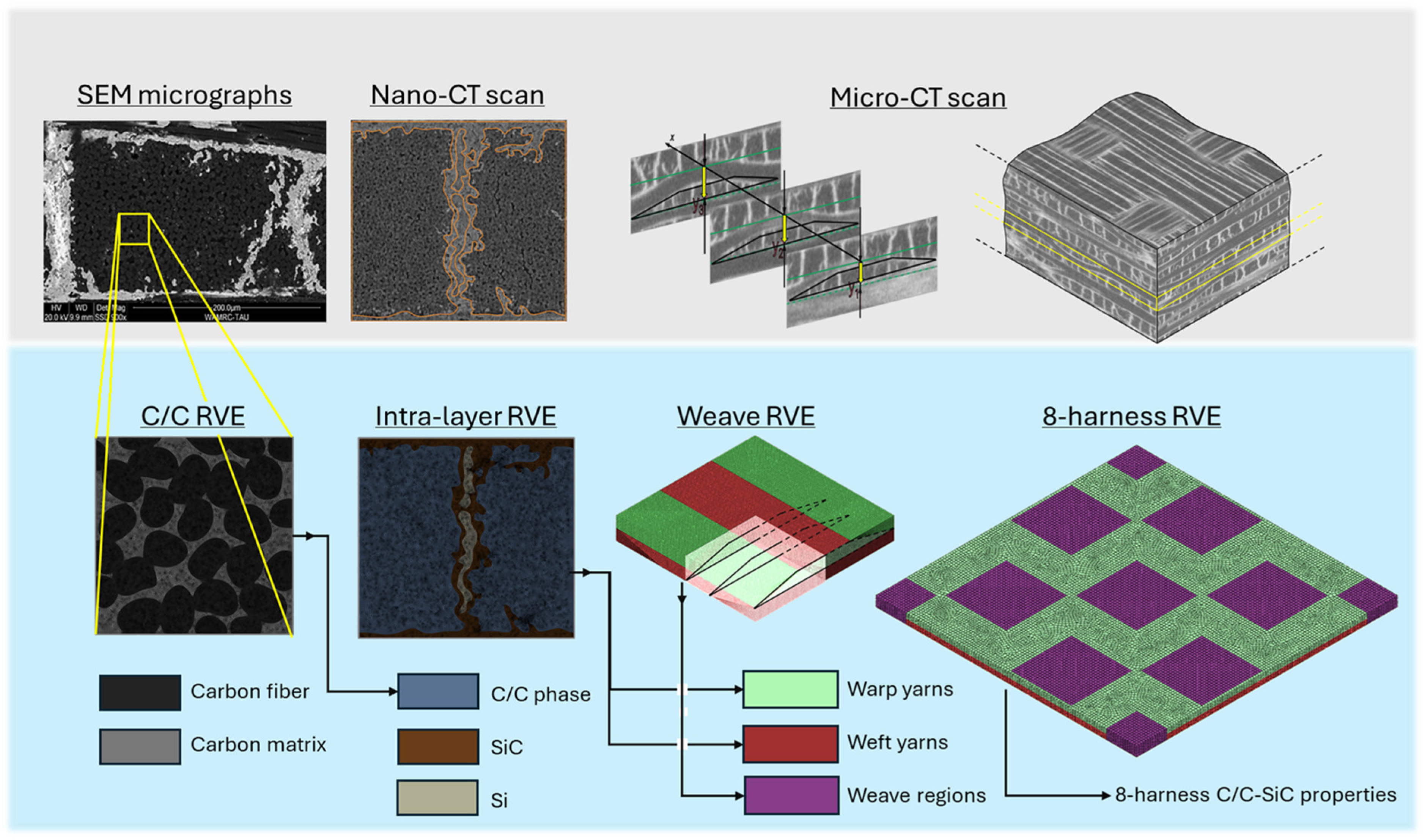 - A CT- and SEM-informed hierarchical RVE construction was developed, spanning the fiber/matrix micro-scale, the intra-yarn meso-scale, and the full 8-harness satin ply scale, thereby resolving microstructural features across more than three orders of magnitude in length scale.