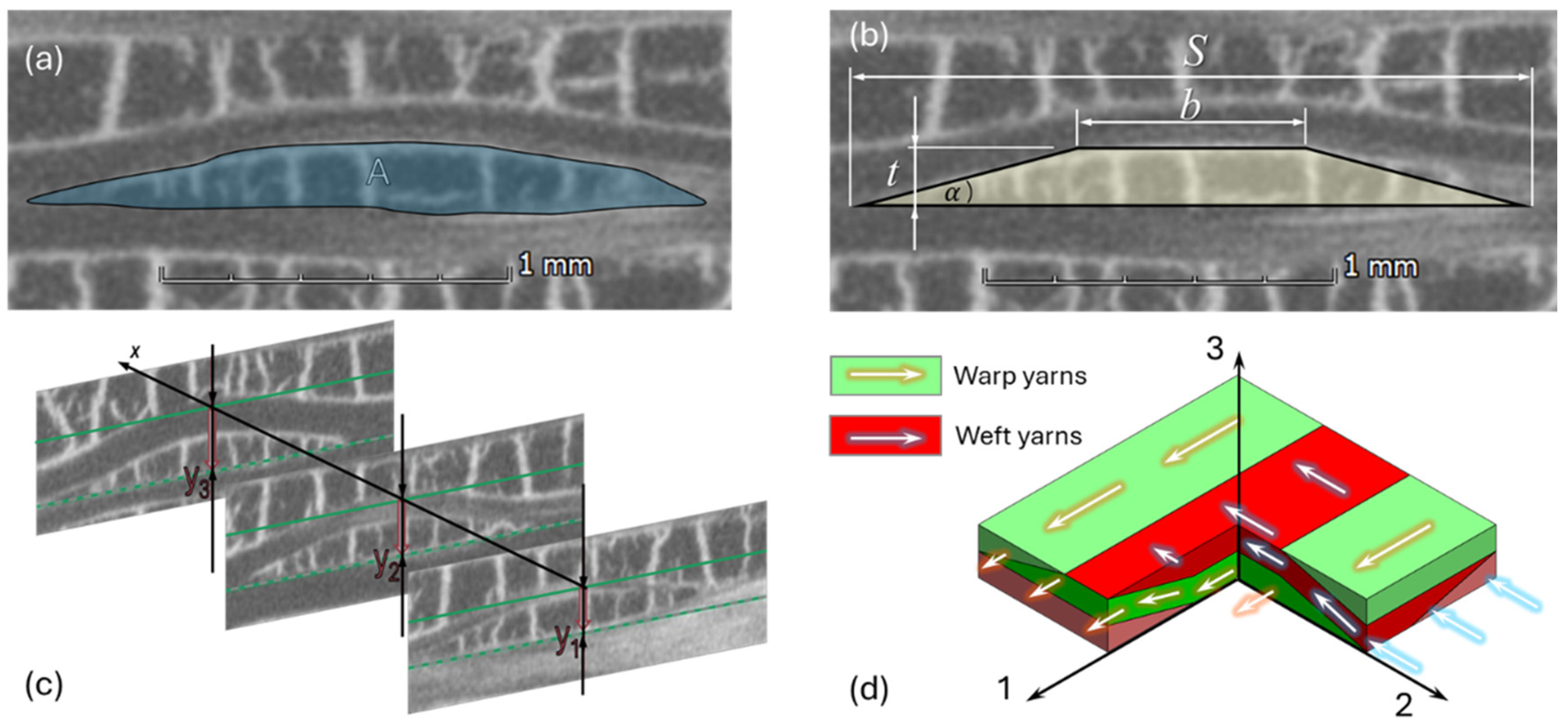 - A physically representative geometric description of the woven architecture was achieved using a trapezoidal yarn cross-section approximation, eliminating artificial residual volumes (often interpreted as resin pockets in other composite systems) and enforcing continuous surface contact between interlacing yarns.