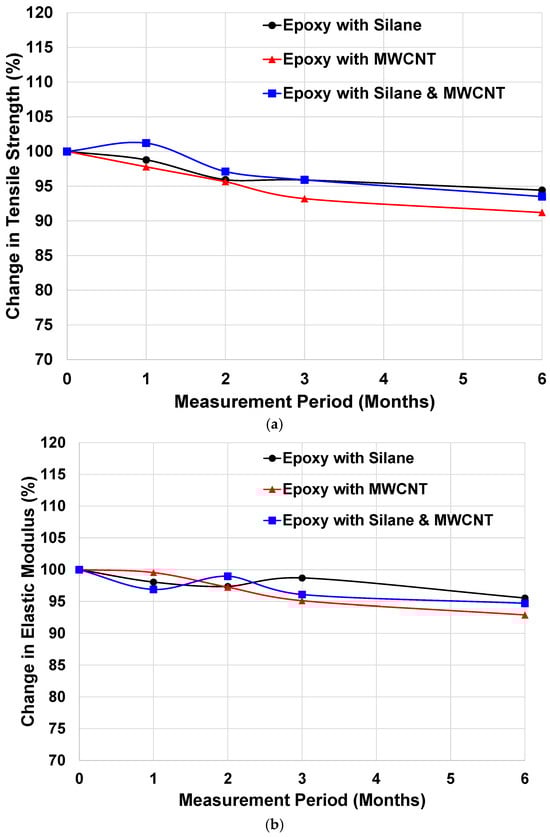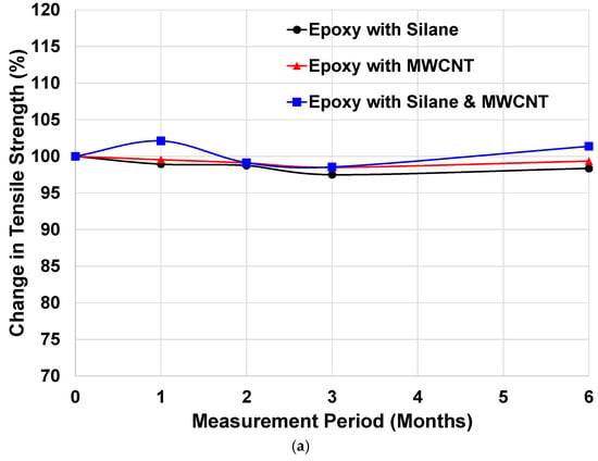 Subsequently, two different alkaline environments were examined, and the results are summarized in Figure 6. Unlike the marine exposure results, all samples exhibited gradual performance reductions over time, with maximum decreases of approximately 7% [39]. Regardless of alkaline solution type, the degradation trends were consistent among the additive groups. The largest reduction occurred in the Epoxy with MWCNT rebars, whereas the Epoxy with Silane rebars showed the smallest decrease.