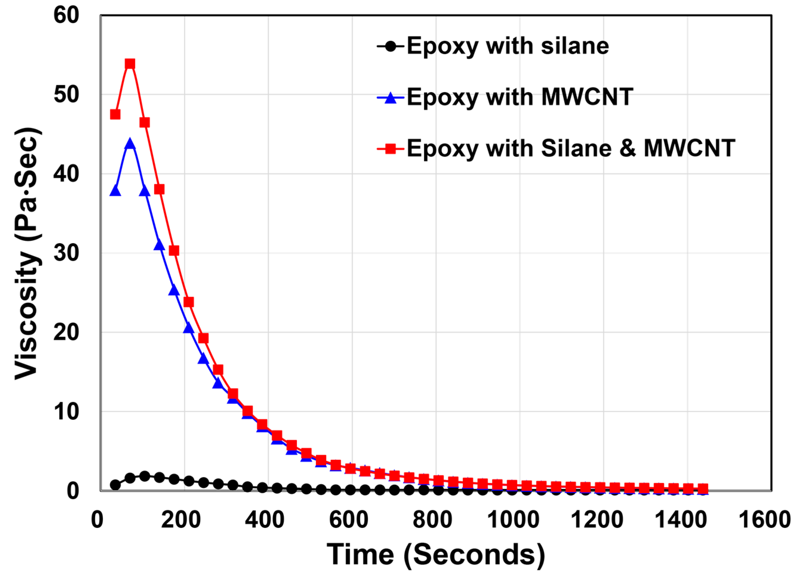 - The incorporation of silane coupling agents and MWCNTs increased the working time of the epoxy matrix, and although MWCNTs initially increased viscosity, all mixtures reached stable viscosity levels suitable for pultrusion processing.