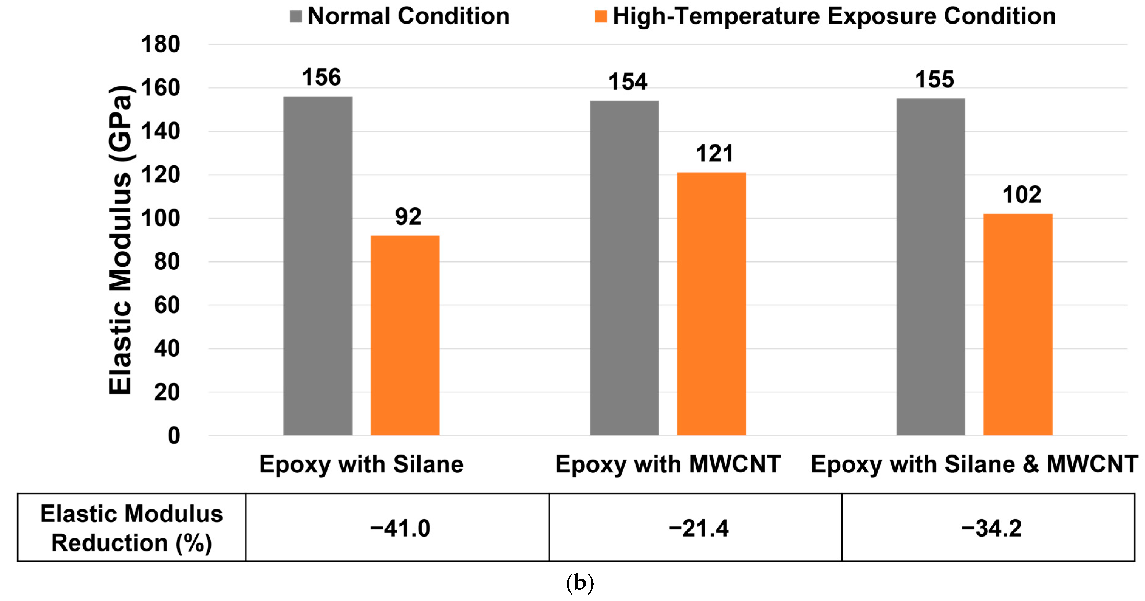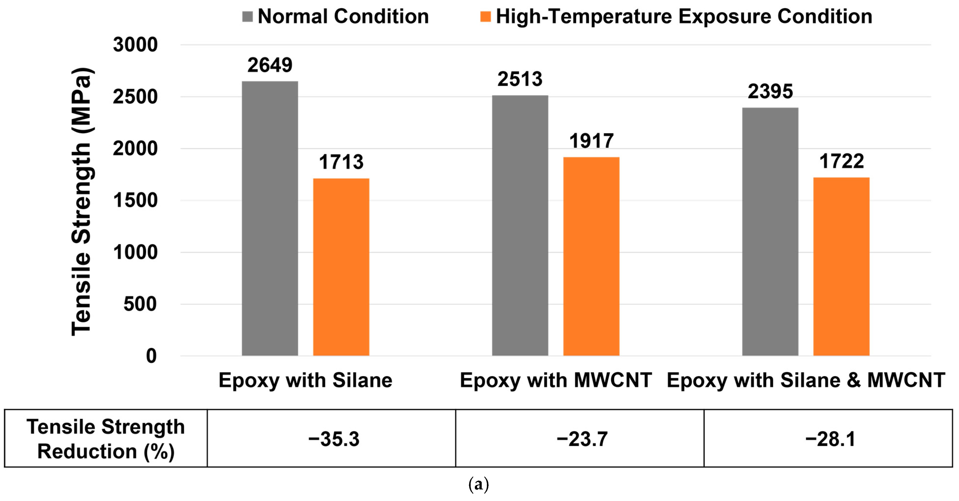 - All additive-modified CFRP rebars exhibited higher tensile strength and elastic modulus than those fabricated with unmodified epoxy. Silane provided the greatest mechanical enhancement by improving fiber–matrix interfacial adhesion, while the combined use of silane and MWCNTs resulted in an antagonistic effect due to interfacial competition and increased viscosity.