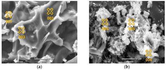 Regarding the carbonaceous phase, the EDS data do not show a systematic increase in surface C content with increasing pyrolysis temperature from 400 °C to 800 °C. For example, some of the highest C contents (>84 at.%) are recorded at 400 °C (Point 002) and 600 °C (Point 009), while some of the lowest (<66 at.%) are found at 700 °C and 800 °C (Points 010, 011, 015). This apparent lack of correlation suggests that at the microscale, the local surface chemistry is more strongly influenced by the proximity to inorganic deposits and the resulting contrast in atomic number, rather than by the average bulk carbonization degree.
