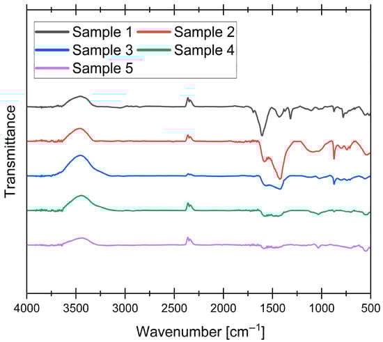 FT-IR is an analytical technique widely used for the characterization of materials based on their molecular composition. In the context of AC derived from grape seeds, FT-IR analysis provides valuable insights into the chemical structure and functional groups present in the material, thereby enabling a comprehensive understanding of its properties and potential applications. To determine the impact of synthesis parameters on the mentioned properties of our samples, we analyzed all of them, and the results are shown in Figure 5 (raw spectra without baseline corrections are presented in Supplementary Data Figure S1).
