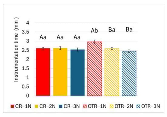 Instrumentation time for continuous rotation (CR) and optimum torque reverse (OTR) motion. Results are expressed as mean ± standard deviation (n = 9). Different uppercase letters denote statistically significant differences (p < 0.05) within the same rotational mode. Different lowercase letters denote statistically significant differences (p < 0.05) within the same downward load condition.